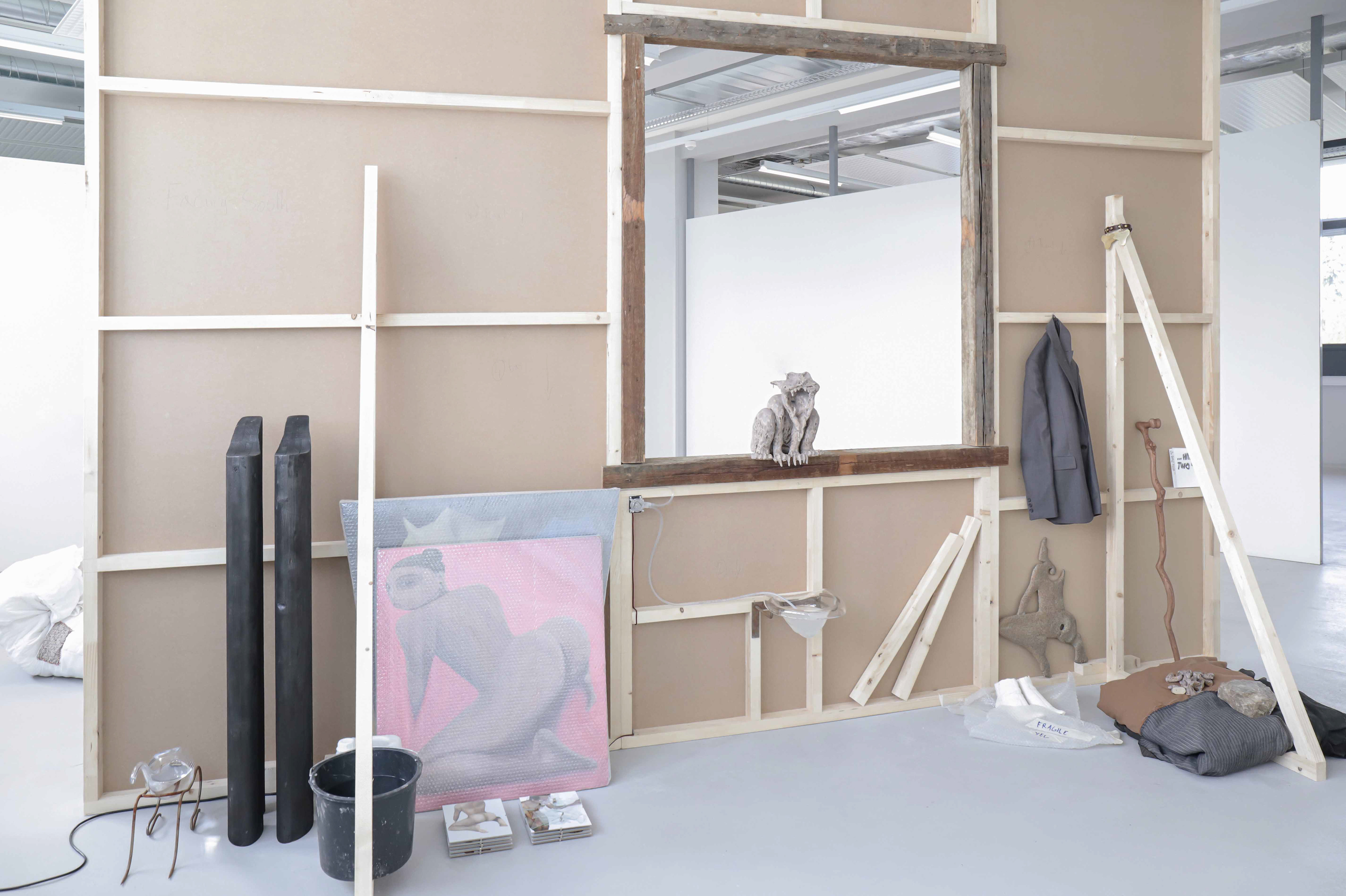 Performing myself, mdf boards, pine logs, Q3 paint, wooden beams,