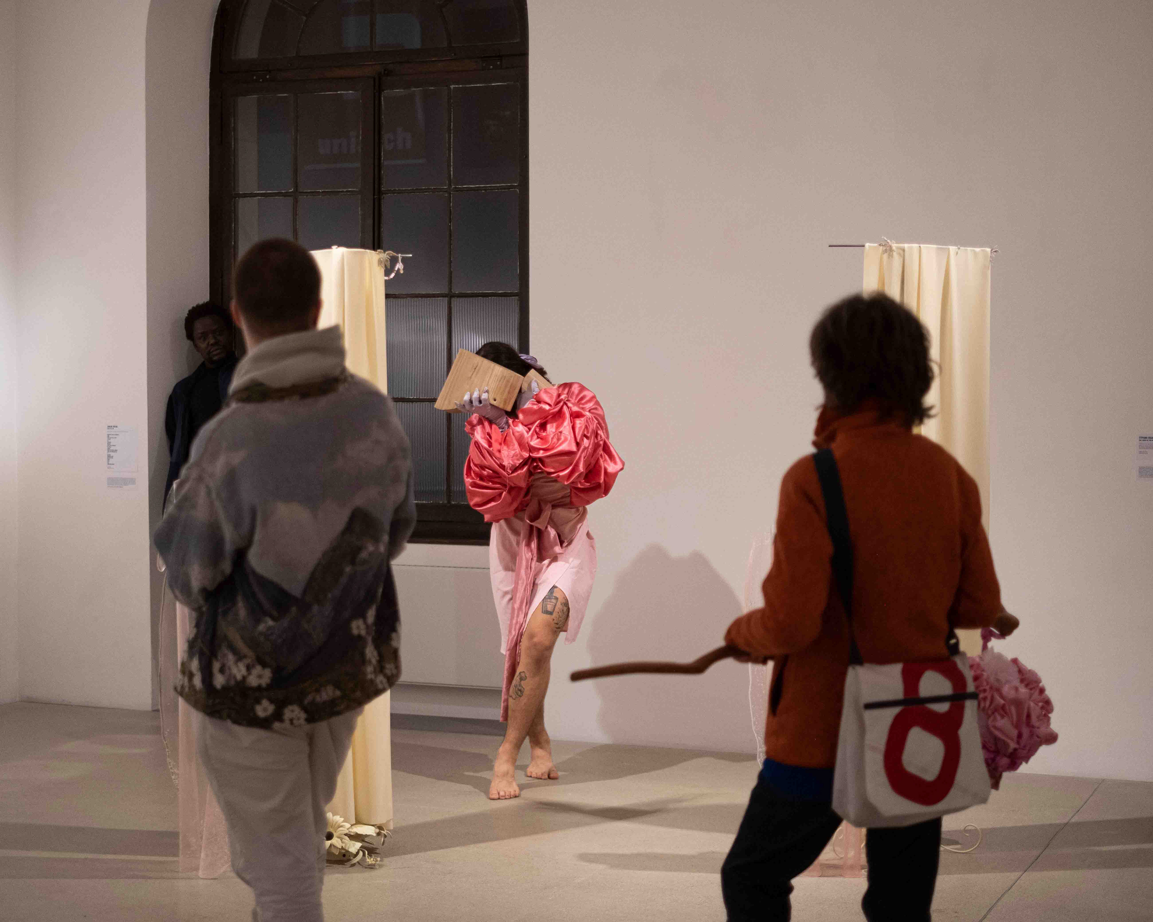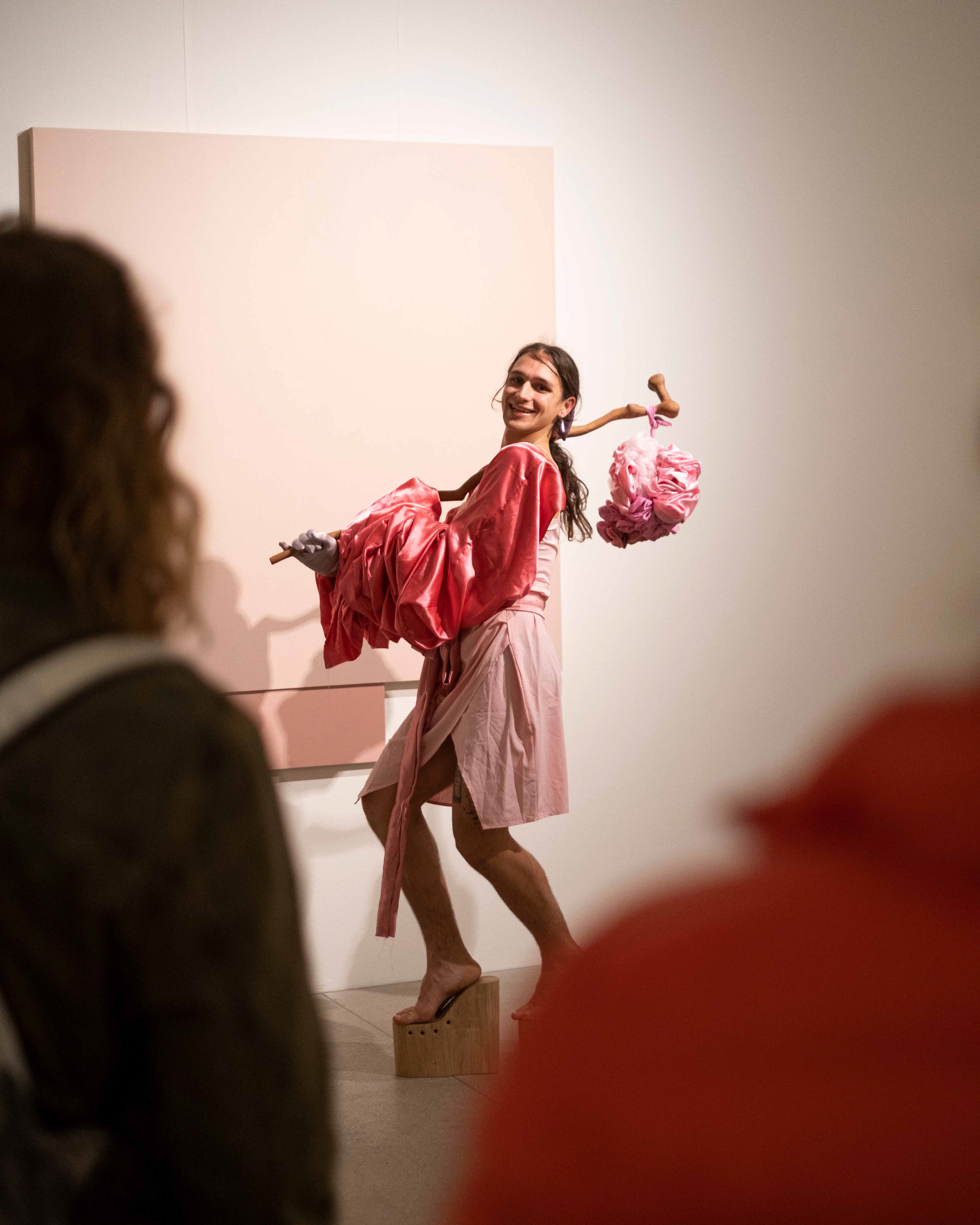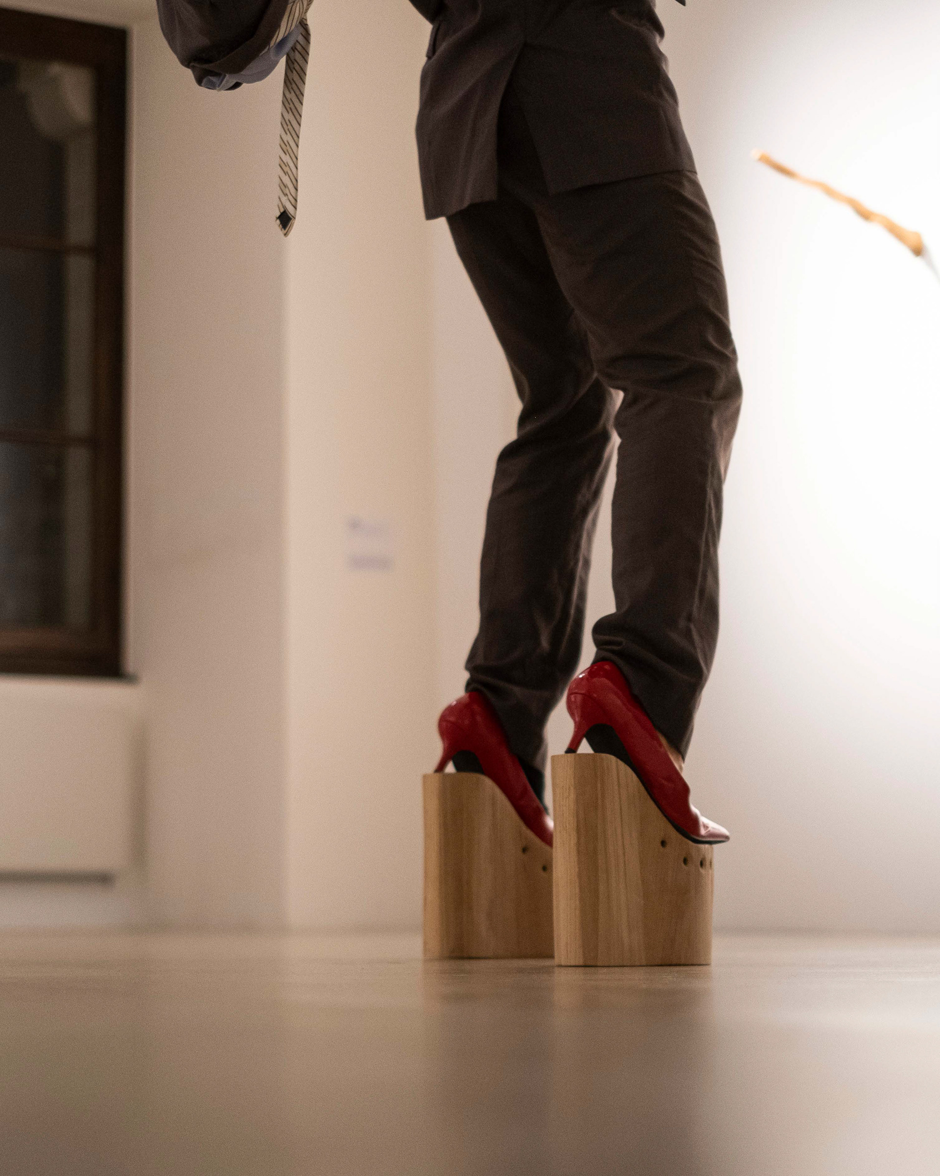 "Like a mysterious apparition, Yel K. Banto wanders through the exhibition room, roaming freely, making the environment their own and letting their body express itself with the only music being the creaking of the Espace Arlaud's wooden floor and the clatter of their handmade wooden heels on the stone floor.