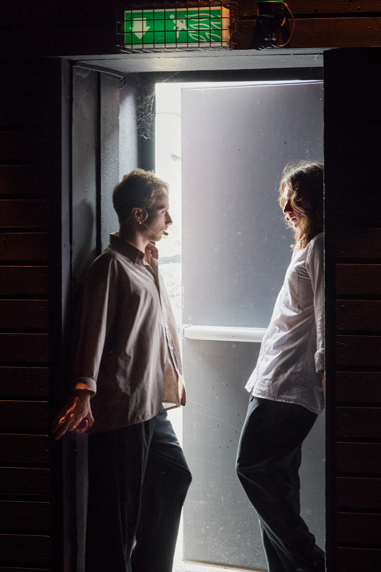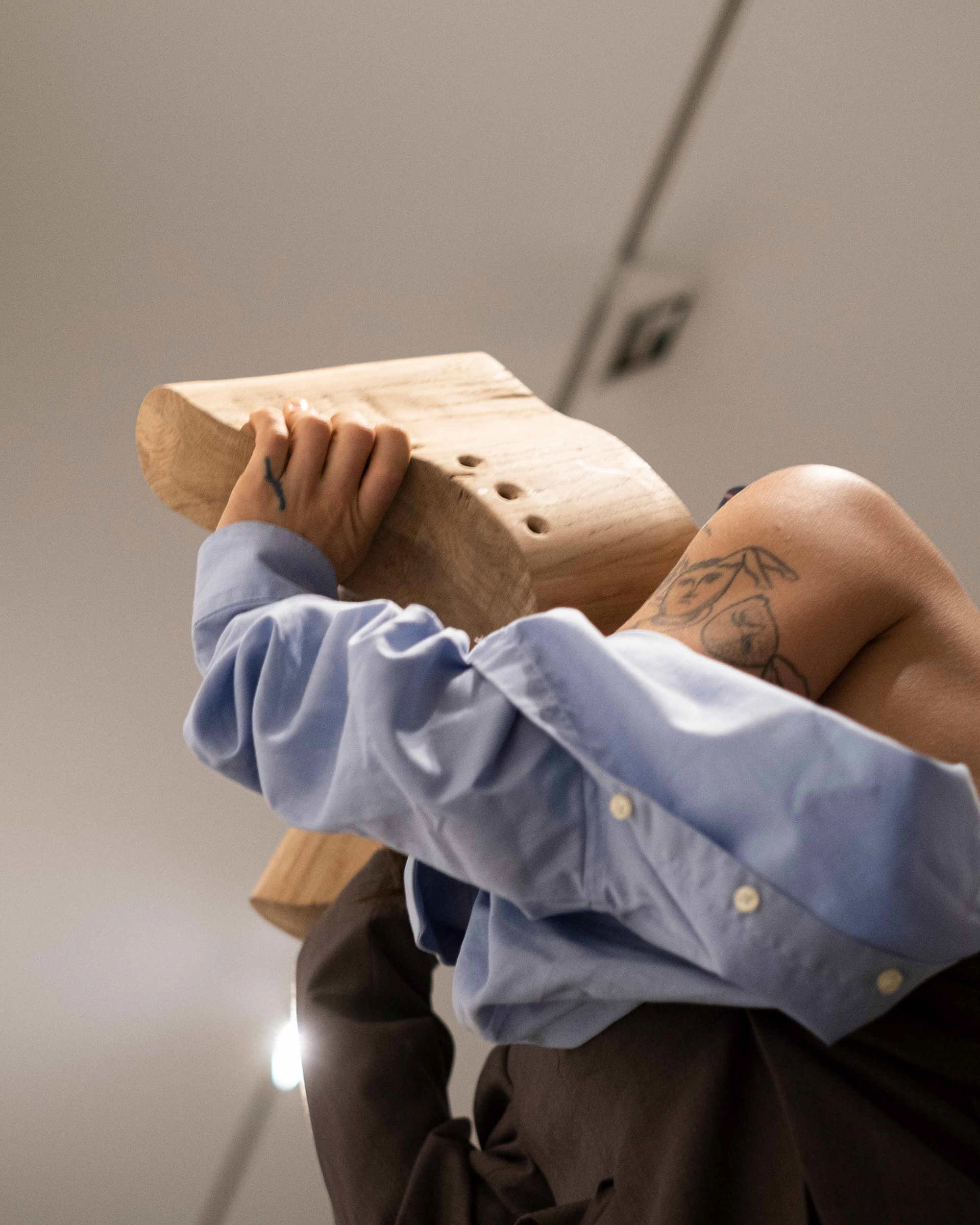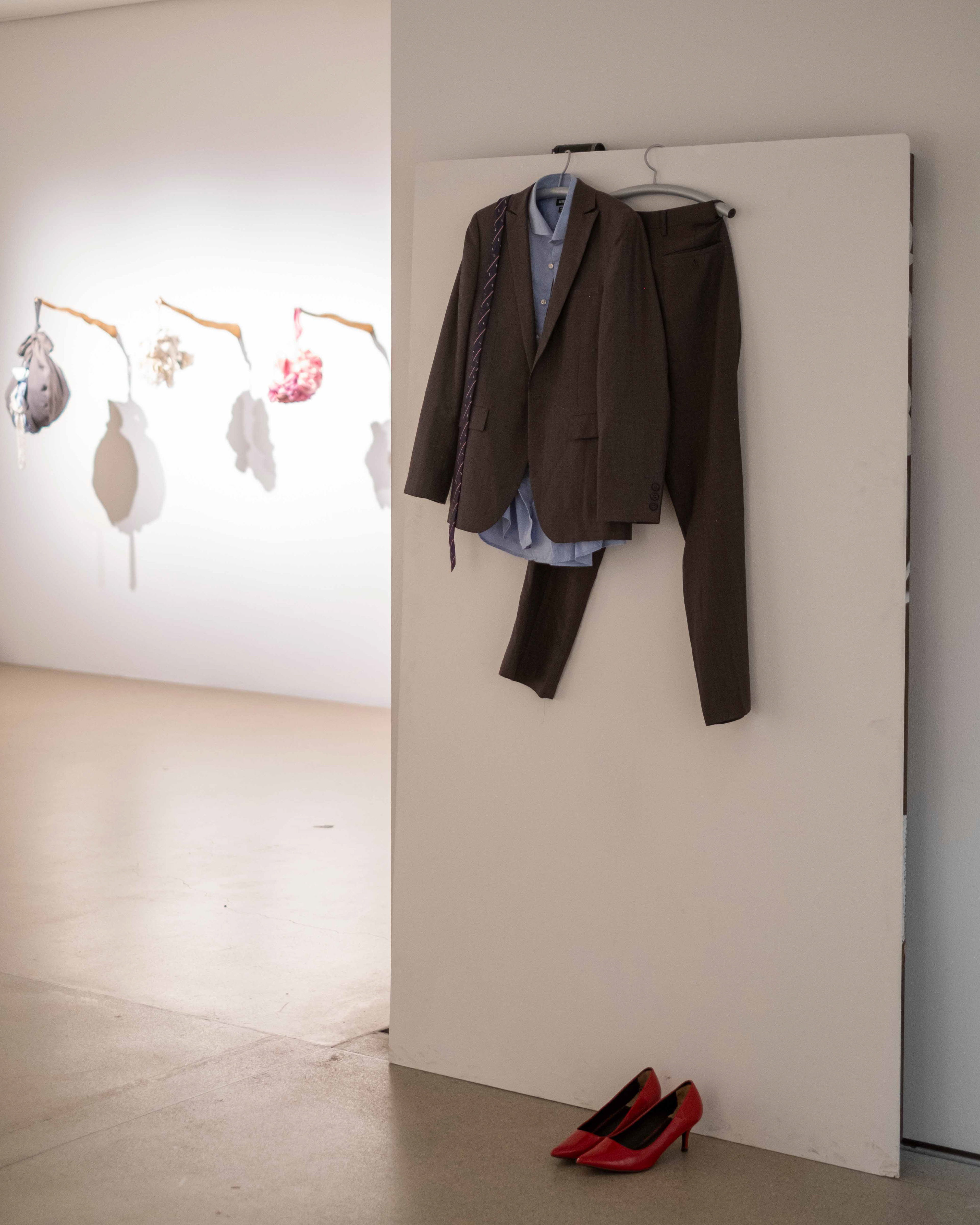 "Like a mysterious apparition, Yel K. Banto wanders through the exhibition room, roaming freely, making the environment their own and letting their body express itself with the only music being the creaking of the Espace Arlaud's wooden floor and the clatter of their handmade wooden heels on the stone floor.
