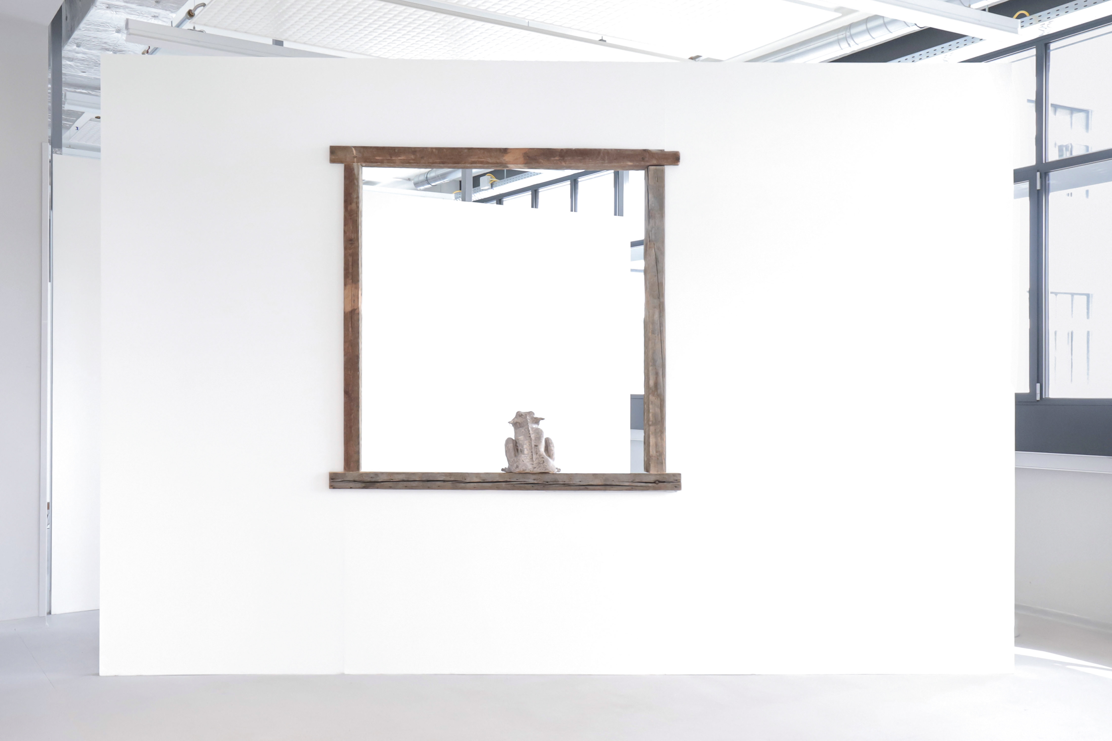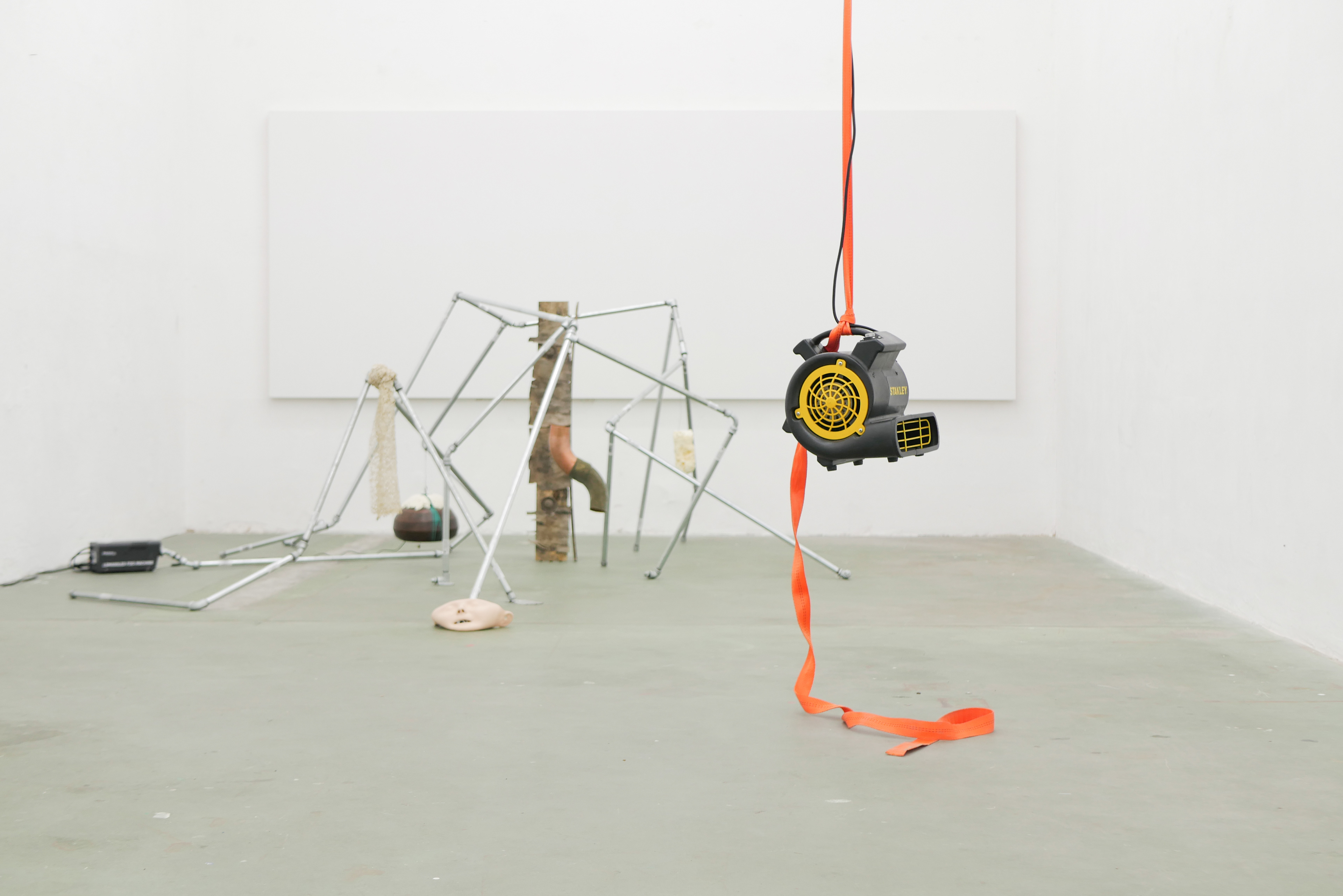 Barking Dogs, installation of two paintings, a sprayed text and a sculpture,