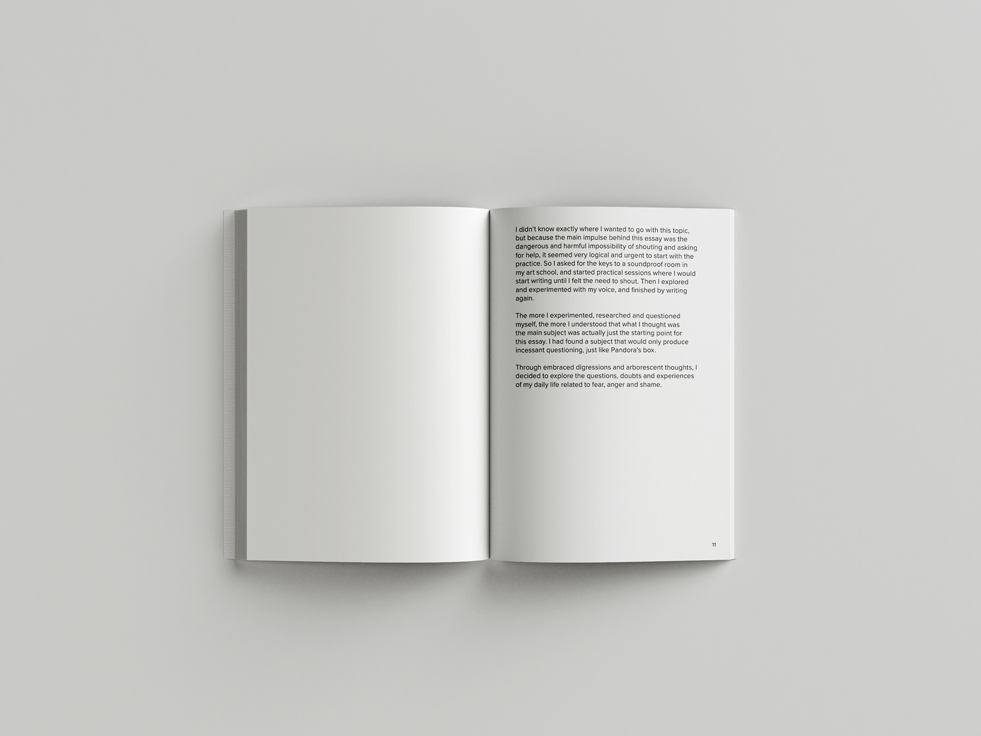 This essay is an investigation of my inability to shout, a blockage that I have experienced for a long time, and that became a problem when I needed help. As I was practising and exploring shouting exercises in a soundproof room, I documented my daily life, my concerns, my transition as a non-binary young adult, and the unfolding of what was hidden behind the inability of shouting.